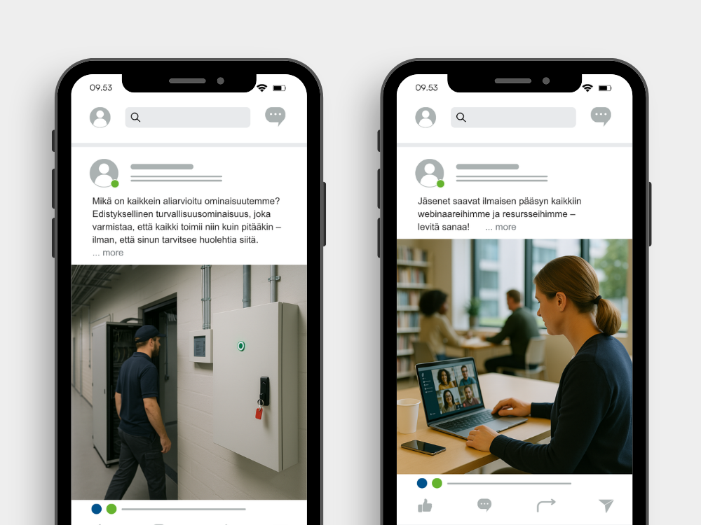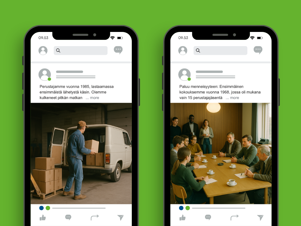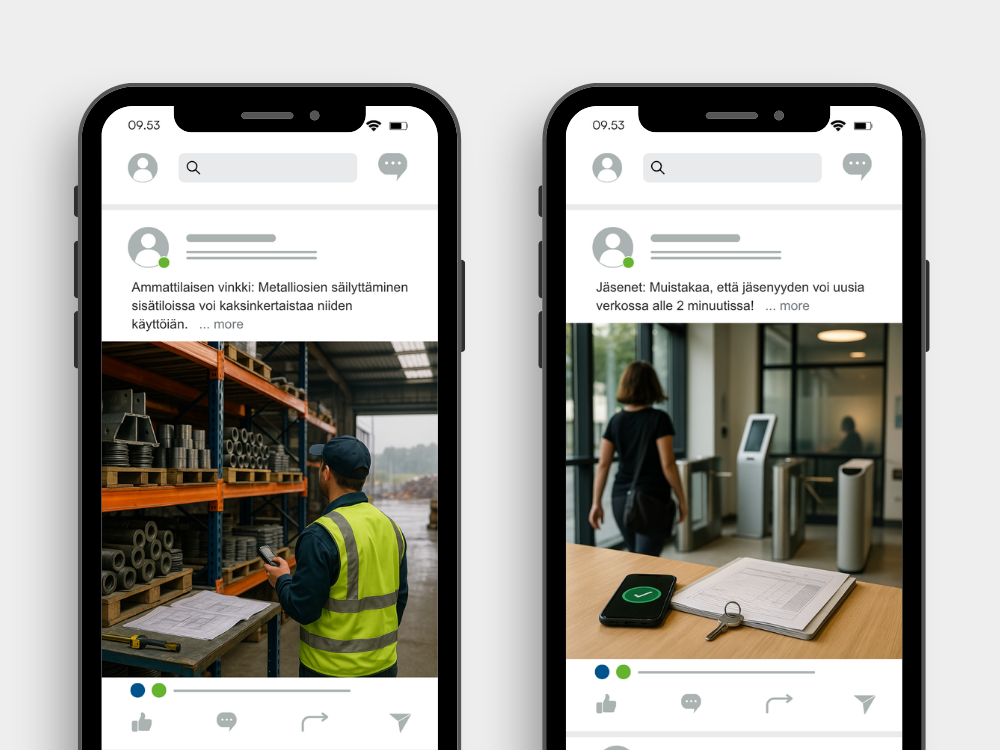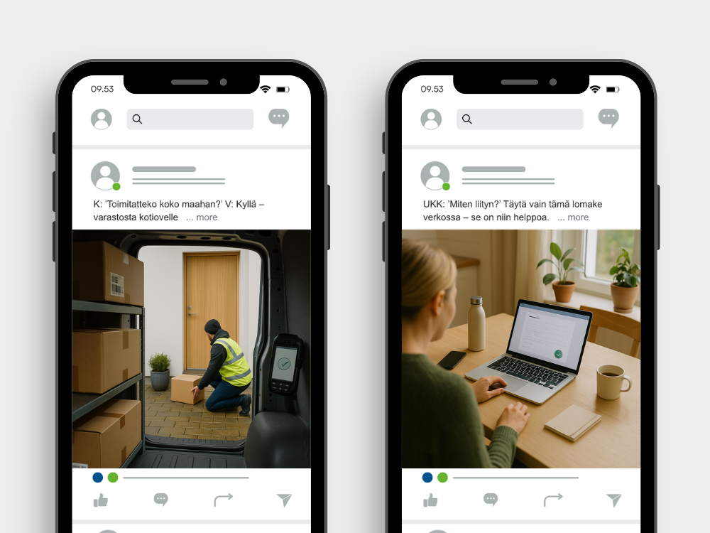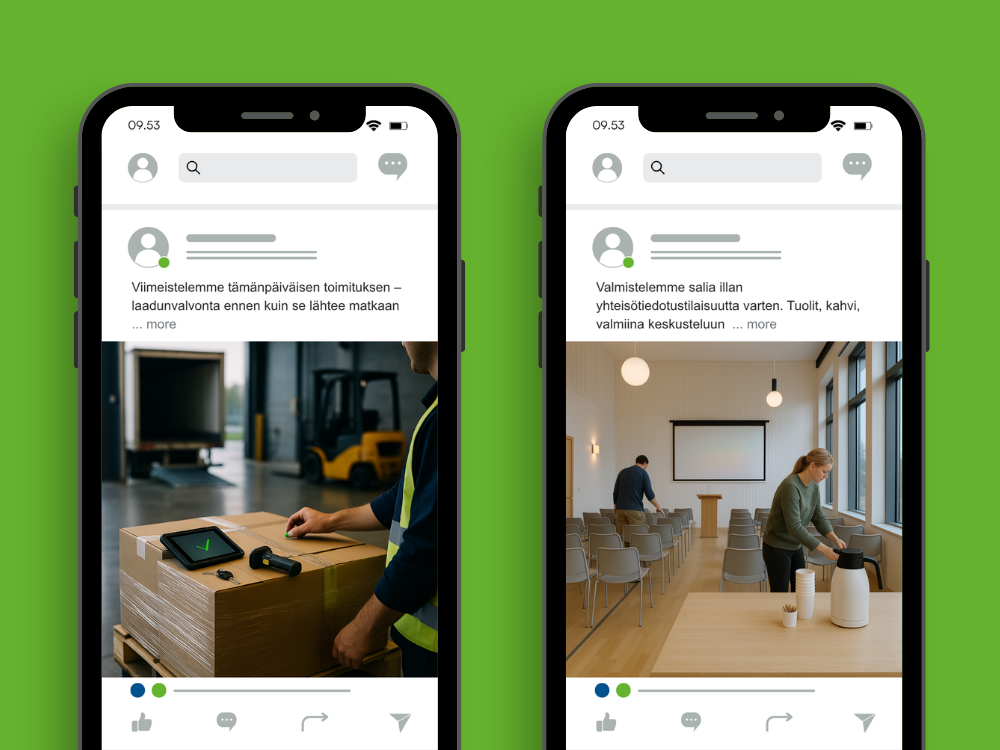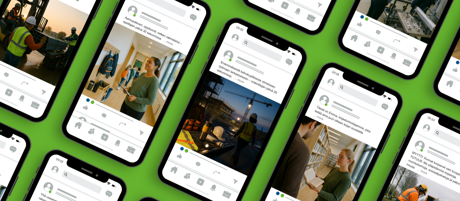 Huomautus esimerkeistä: Sosiaalisen median julkaisuesimerkeissä näkyvät kuvat ovat tekoälyn luomia paikkamerkkejä. Kun alat testata näitä ideoita, käytä omia valokuviasi tai videomateriaaliasi, jotta sisältö on aitoa ja brändin mukaista. Jos olet äskettäin toteuttanut projektin kanssamme, sinulla on jo MySite-sivustolla kuvakirjasto (ja ehkä myös videokirjasto), jota voit käyttää sosiaalisen median julkaisuissa.