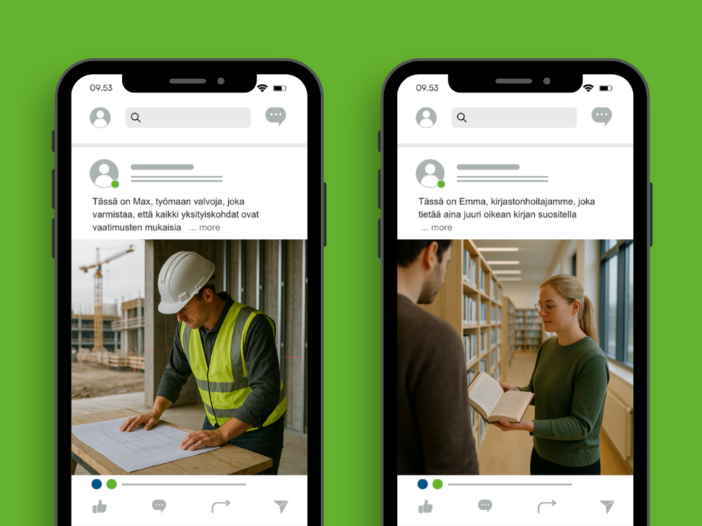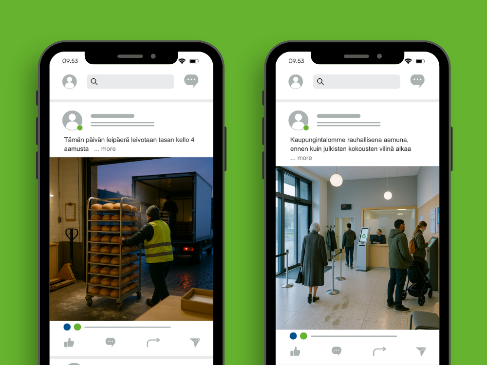 - Lisää sopiva visuaalinen elementti (valokuva, lyhyt videoleike tai grafiikka) jokaiseen julkaisuun
